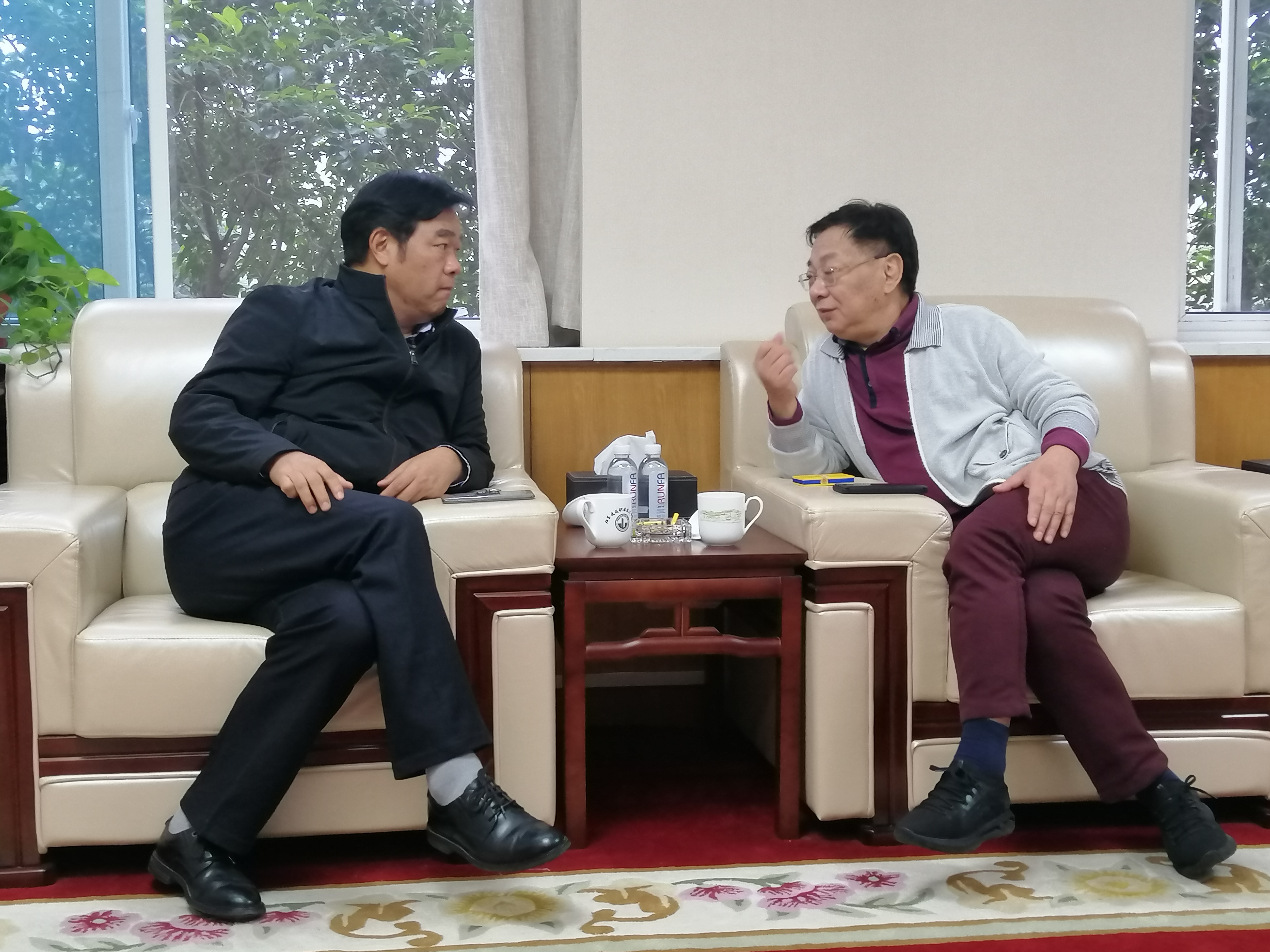 1015下午,校党委书记孙进教授在学校行政楼接待室与校友王凯进行会谈。